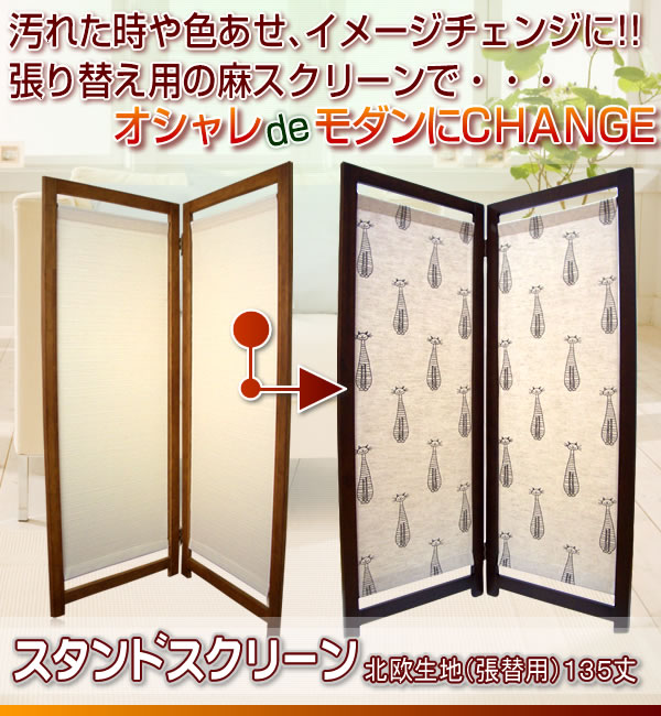 汚れや色あせ、イメージチェンジにおすすめの張り替え用スクリーンです。上質なリトアニア麻生地を使用したネコ柄と花柄の北欧テイストな生地はお部屋をオシャレな空間に演出します。サイズ/430×1150mm ※サプライヤー直送品【商品名】スタンドスクリーン北欧麻生地(張替用)135丈 cat