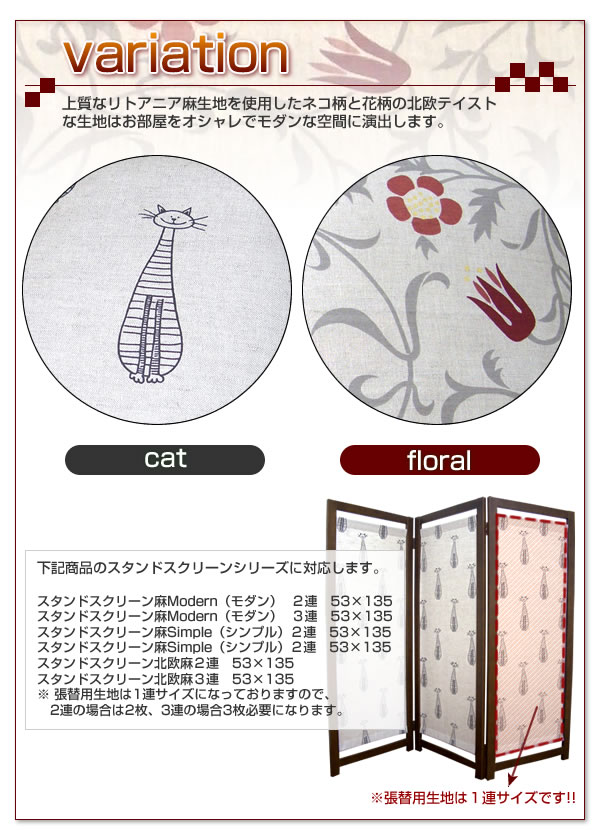 汚れや色あせ、イメージチェンジにおすすめの張り替え用スクリーンです。上質なリトアニア麻生地を使用したネコ柄と花柄の北欧テイストな生地はお部屋をオシャレな空間に演出します。