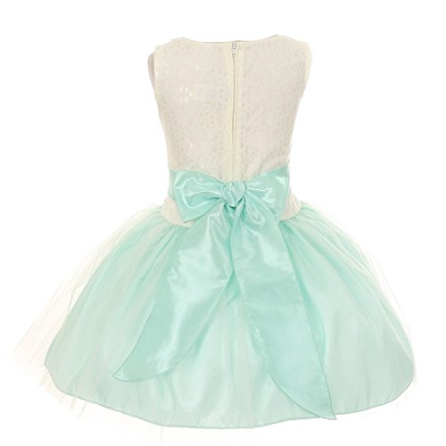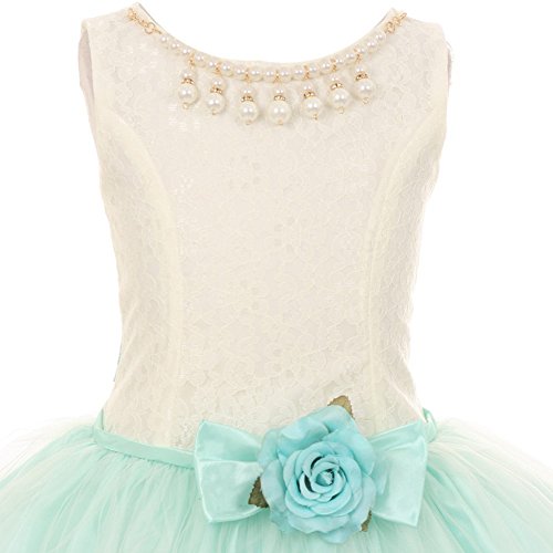 Beautiful lovely lace and taffeta dress with overlay tulle skirt. This gorgeous short dress features fabulous detachable pearl and rhinestone necklace. The waist is accented by a beautiful flower that compliments perfectly with the dress. Have your little girl wear this dress for any special event.Feature