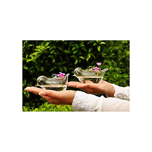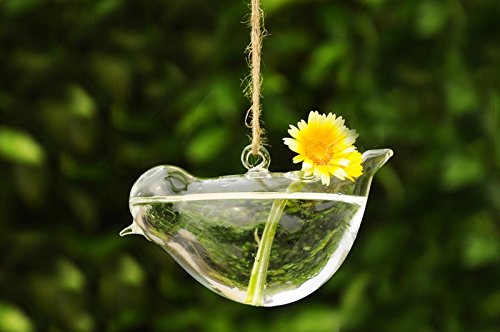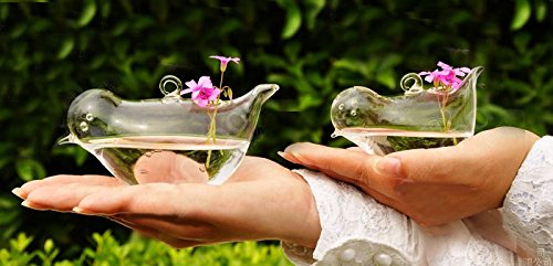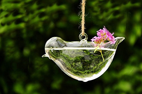 Birds are always welcome to the garden and these handblown clear glass flyers are no exception. Hang indoors or out and place small flowers, air plants or succulents that creates a colorful display. larger one measures 5"(L)x3"(H)x2.2"(W) small one measures 4.5"(L)x2.5"(H)X2"(W)Feature