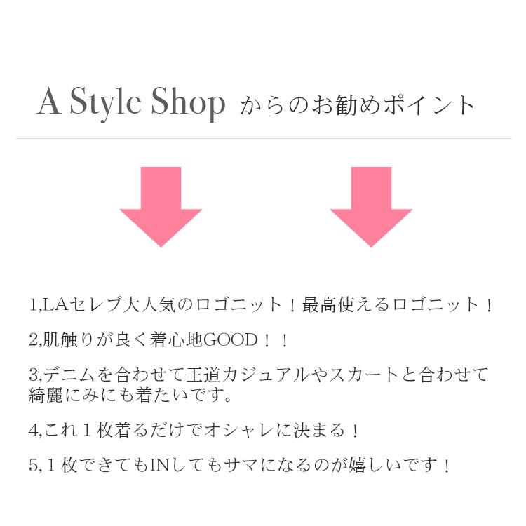 | スタッフコメント | LAセレブ大人気のロゴニット!最高使えるロゴニット!肌触りが良く着心地GOOD!!デニムを合わせて王道カジュアルやスカートと合わせて綺麗にみにも着たいです。 これ1枚着るだけでオシャレに決まる!1枚できてもINしてもサマになるのが嬉しいです♪♪ デニムやショットパンツに合わせてもぱっちりです^^ |
