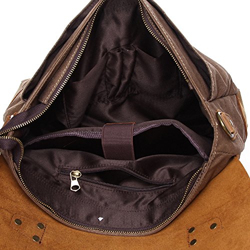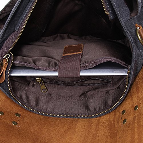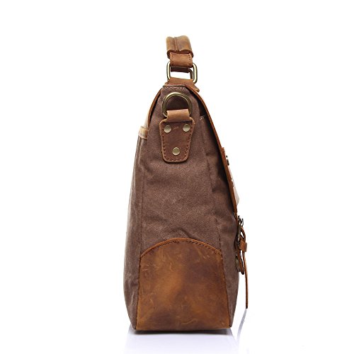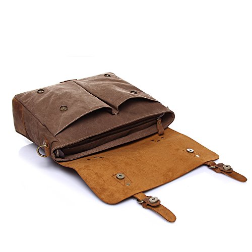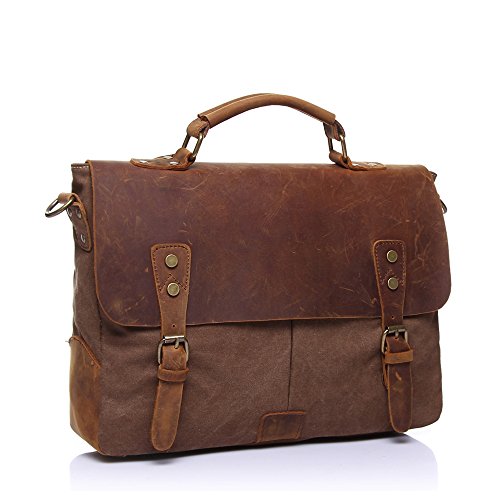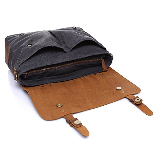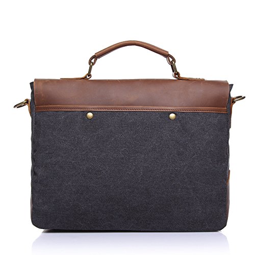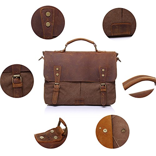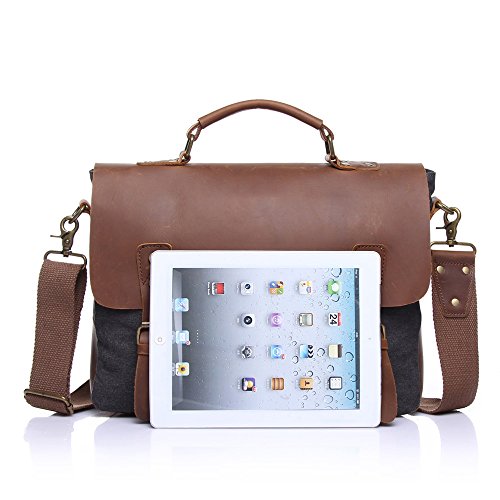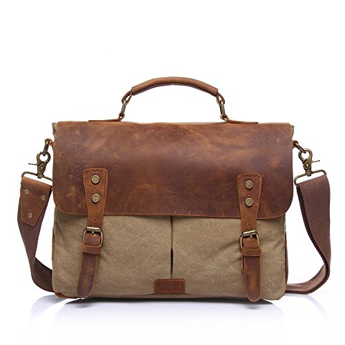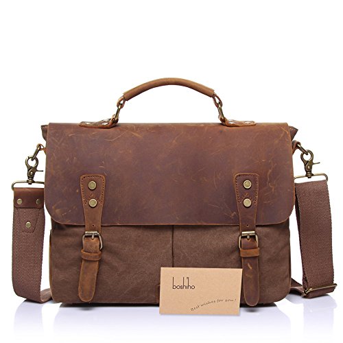 -. Brand : boshiho -. Department : mens -. Feature : Boshiho briefcase bag made by canvas and crazy horse leather / Color: Dark Gray Khaki and Coffee / Dimensions: 14.5"(L)*4.33"(W)*11.8"(H). Main bag includes padded laptop compartment which can fit up to 14 inch Mackbook Pro/ Ultrabook/ Chromebook/ Notebook / Structure: 1 large rear outer pocket + 2 front open pockets + 2 main compartment + 1 zipper pocket and many small open pockets + zipper and magnetic snap + 1 leather top carry handle + 1 adjustable canvas shoulder strap / With detachable and adjustable shoulder straps for comfortable wearing, no compression feeling at all. 3 Ways to hold as: handbags, shoulder bags, crossbody bags -. PackageQuantity : 1 -. ProductGroup : Apparel -. ProductTypeName : LAGE -. Size : 14.5 x 4.33 x 11.8 inch -. Title : Boshiho Mens Canvas Leather Flap-over Briefcase Vintage Messenger Bag for Laptop