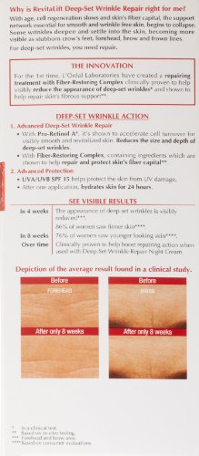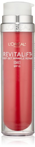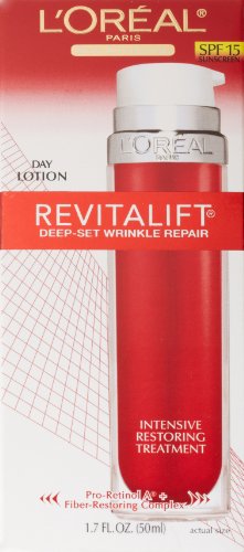 -. Binding : Health and Beauty -. Brand : L'Oreal Paris -. EAN : 0071249154434 -. Feature : Intensive restoring treatment to reduce the size and depth of wrinkles / Formulated with Pro-Retinol A and Fiber-Restoring Complex to reduce the size and depth of wrinkles / In clinical tests after 4 weeks women saw a reduction in wrinkles and that skin was noticeably firmer / Broad spectrum UVA/UVB SPF 15 / Net Wt. 1.7 oz -. IsAdultProduct : 0 -. Label : L'Oreal Paris Skin Care -. Manufacturer : L'Oreal Paris Skin Care -. Model : L'OREAL374645 -. MPN : LH15443 -. NumberOfItems : 1 -. PackageQuantity : 1 -. PartNumber : LH15443 -. ProductGroup : Beauty -. ProductTypeName : BEAUTY -. PublicationDate : 2010-11-12 -. Publisher : L'Oreal Paris Skin Care -. Size : 1.7 -. Studio : L'Oreal Paris Skin Care -. Title : L'Oreal Paris RevitaLift Deep-Set Wrinkle Repair Day Lotion SPF 15, 1.7 Fluid Ounce -. UPC : 071249154434