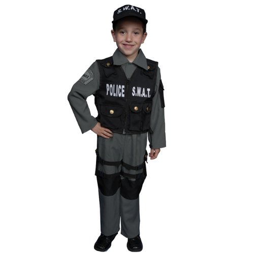 -. Binding : Toy -. Brand : Dress Up America -. Color : Grey and Black -. Department : boys -. Feature : All Clear! -. Label : Dress Up America -. Manufacturer : Dress Up America -. PackageQuantity : 1 -. ProductGroup : Apparel -. ProductTypeName : TOYS_AND_GAMES -. Publisher : Dress Up America -. Studio : Dress Up America -. Title : Deluxe S.W.A.T. Officer Kids Costume