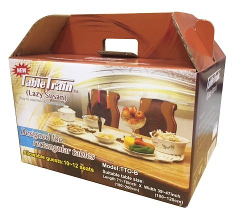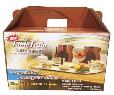 Product Description The new unique Table Train (Lazy Susan / turntable for large rectangle and oval dining tables) comes in two Models: Table Train (TTO-A) and Table Train (TTO-B). Product Dimensions: L x W x H of Model TTO: A is 40.1" x 23.6" x 1.1" and is suitable for table of 6-8 Seats. L x W x H of Model TTO: B is 54.7" x 23.6" x 1.1" and is suitable for table of 10-12 Seats. Product is made of thermoplastic and comes with these components in the package (1) Guide rails - Straight rails 2 or 4 depending on the model and 4 half-circle rails and (2) Plates that rotate on the rails using the rollers at the bottom - 2 types of plates (the number of plates depends on the model). When assembled, the plates with rollers at the bottom are placed and locked onto the base rail for a very smooth and arrayed movement of the plates while withstanding a load of up to 40 kilograms (88 lbs.) or 50 kilograms (110 lbs.) depending on the model. The color of rails is white and the plates are in granite gray texture. For oversized dining tables, extension kits (sold separately) have 8 plates and 2 straight rails and can extend the TTO: B model length by 14.1" (36 Centimeters). 0