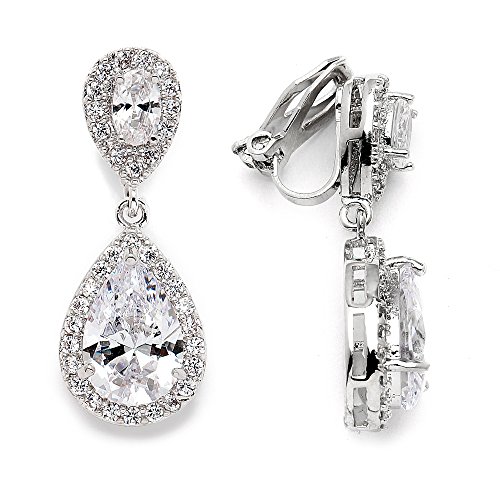 -. Title : Mariell CZ Clip-On Teardrop Wedding Earrings - Dainty Pear-Shaped Cubic Zirconia Dangle Clip Ons