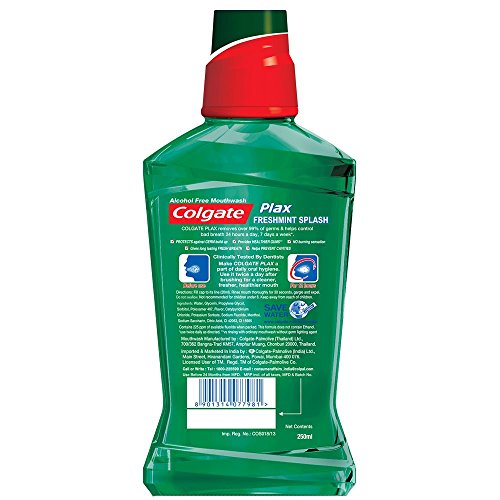 -. Feature : Use Colgate Plax twice a day after brushing for a cleaner, fresher, healthier mouth / Removes upto 99.9% germs thereby providing 12 hour protection against plaque and germs / Provides long lasting fresh breath and prevents cavities / Provides upto 64 percent healthier gums vs rinsing with ordinary mouthwash without germ fighting agent / Alcohol free formulation