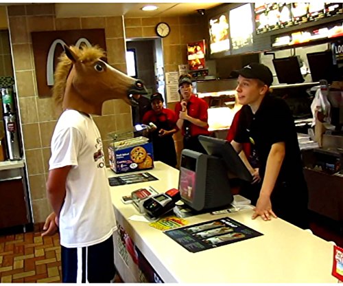 Perfect for Masquerade Parties, Gifts, Costume Parties, Carnival, Christmas, Easter, New Years Eve Party, Halloween, etc. Feature: material: eco-friendly latex Size: Fits most adult heads Allergy warning 1.If you are allergic to latex, don't wear this. 2.This product is normally have a smelling of latex , you can put it on the Ventilation place for one day . Package Included: 1x Latex Horse Head Mask 2x Latex Horse HoovesFeature