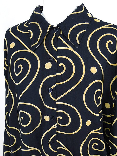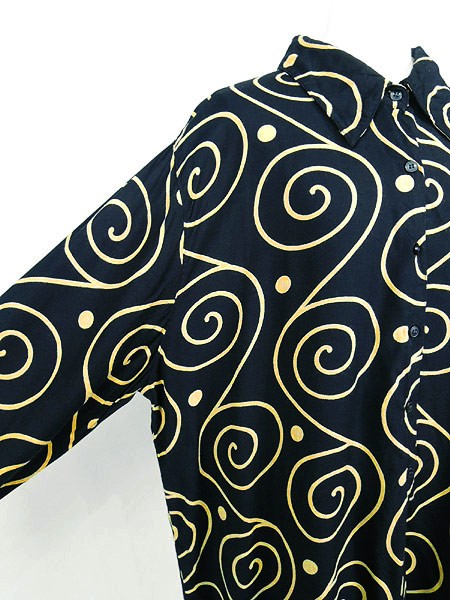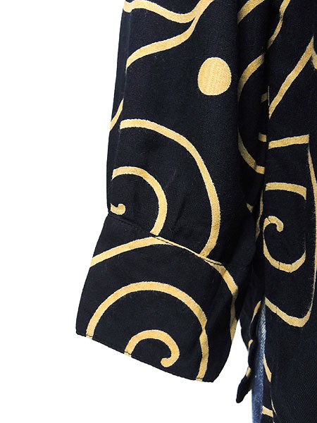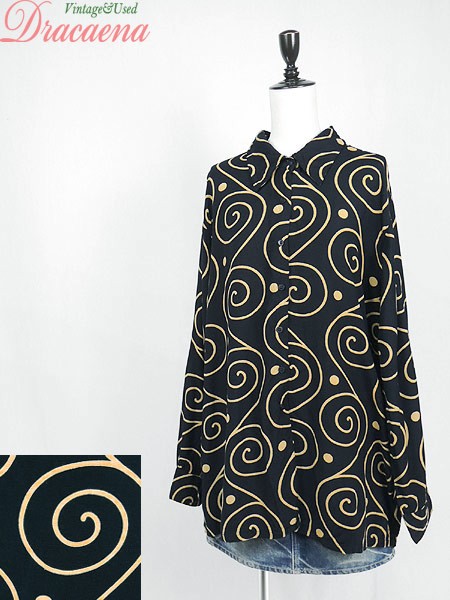 Ladies ブランド- カラー黒ベース・ベージュ メール便不可 コンディション★★★ 素材レーヨン100% 表記サイズ18/20 スタッフコメント唐草模様のようなぐるぐる渦巻き柄。黒にベージュが映えます。左胸に小ヨゴレあり。右胸脇にスレあり。 実寸サイズ 着丈 77 cm 身幅 65 cm 肩幅 48.5 cm 袖丈 61 cm ※ウエスト・ヒップ以外は平置き採寸