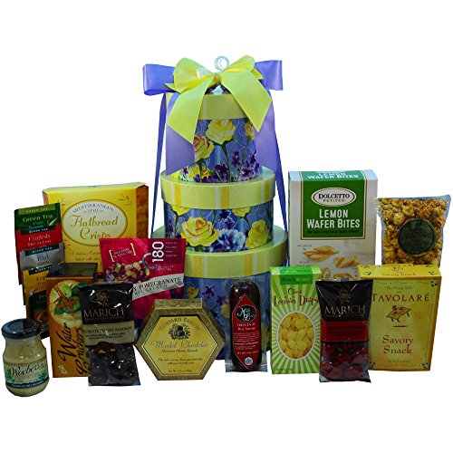 -. Feature : A special gift for a special lady, this beautiful, bright and cheerful gift tower has all she needs to make a snacking gourmet feast! / From sweets to savories, and teas to treats, she is sure to be delighted when she opens each box to discover all that is tucked inside. / After the goodies are gone, the boxes remain and can be used as décor and storage for favorite craft projects and mementos. / Each gift is hand crafted with attention to detail, shrink wrapped, then tied with a bow for presentation, ready for gift giving. / To include a personalized message with your order, please select "GIFT" during checkout.