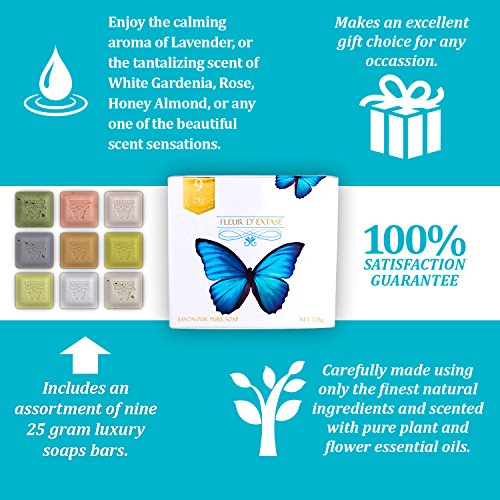 Ecstasy Soap Gift Set in Box (Fleur D' Extase) - Includes An Assortment Of Nine 25 Gram Luxury Soaps Bars In A Beautiful Gift Box. Our natural soaps come in beautiful Gift Boxes and are perfect as gifts for birthday, housewarmings, holidays, mothers days, hostess, white elephant, and teacher gifts.