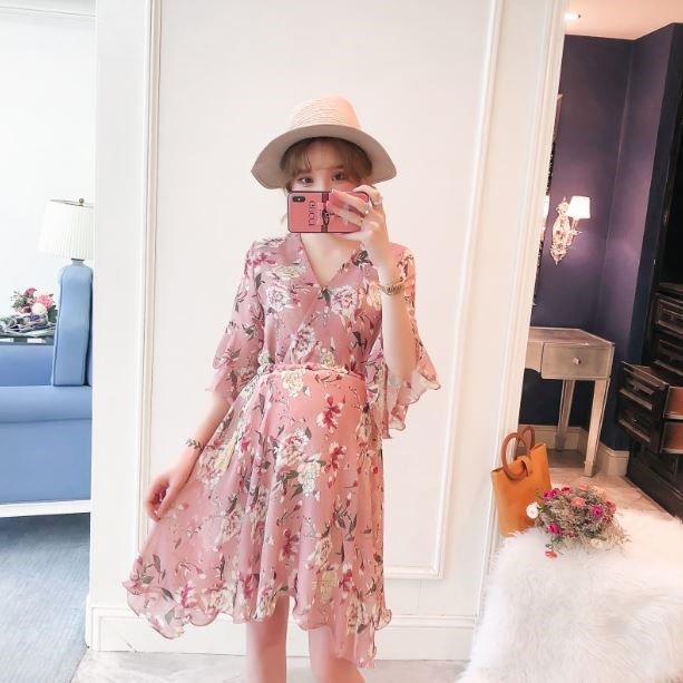 花柄の華やかさがあるマタニティドレス♡