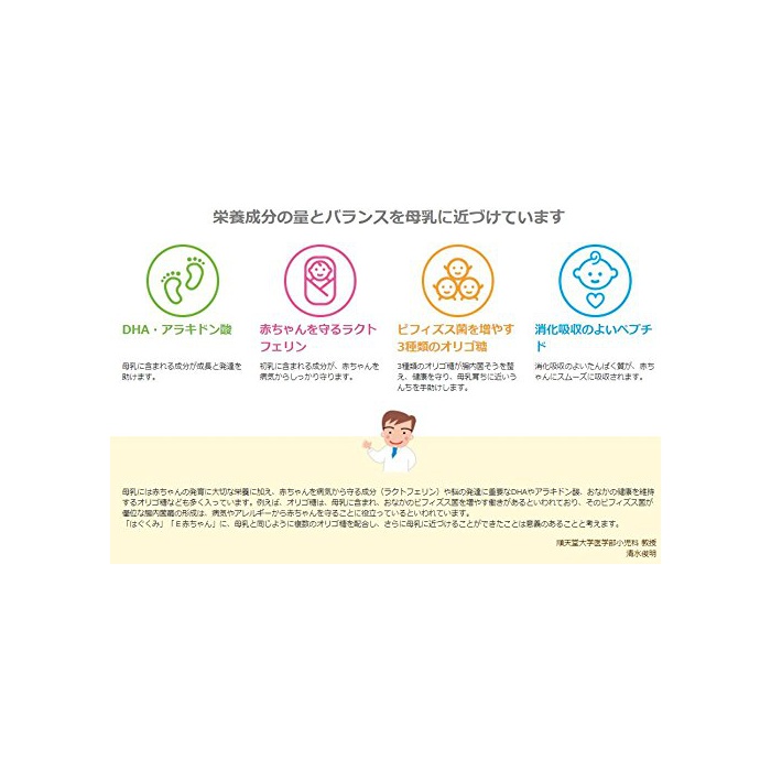 원재료:《호에이파우다》(유청단백질)고, 조정 지방(팜핵유,팜유,대두유)고, 유당,탈지분유,유청단백질 소화물,덱스트린,버터 밀크 파우더,유당 분해액(락《추로스》)고, (Kasein)카세인,갈락토올리고당액당,러프《노스》,정제어유,a la《기돈》산 함유유,(Kasein)카세인 소화물,식염,효모,L-카르니틴,탄산 칼슘,레시틴,염화 마그네슘,비타민C,락토페린,구연산3나트륨,인산 수소2칼륨,콜레스테롤,염화 칼슘,이노시톨,《피로린》산 제2철,비타민E,타우린,유산 아연,시틸딜산 나트륨,비타민D3,판토텐산 칼슘,니코틴산 AMI 드,유리딜산 나트륨,비타민A,유산동,5''-《아데니루》산,inosinic산 나트륨,《구아니루》산 나트륨,비타민B6,비타민B1,엽산,β-카로텐,비타민B12