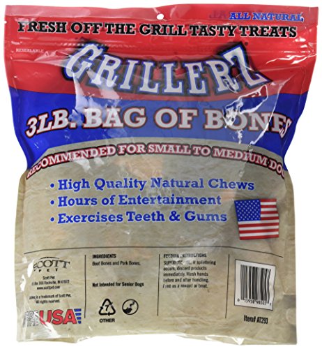 -. Binding : Misc. -. Brand : Scott Pet -. EAN : 0015958985057 -. Feature : Made in the USA / Natural Dog Treats / No artificial ingredients -. Label : Scott Pet -. Manufacturer : Scott Pet -. Model : AT293 -. MPN : AT293 -. NumberOfItems : 1 -. PackageQuantity : 1 -. PartNumber : AT293 -. ProductGroup : Pet Products -. ProductTypeName : PET_SUPPLIES -. Publisher : Scott Pet -. Size : One Size -. Studio : Scott Pet -. Title : Scott Pet AT293 3 lb Bag 'O Bones, One Size -. UPC : 015958985057