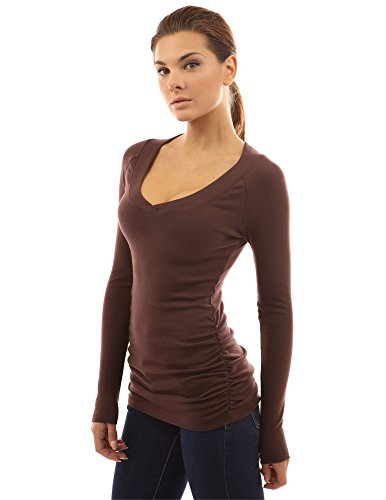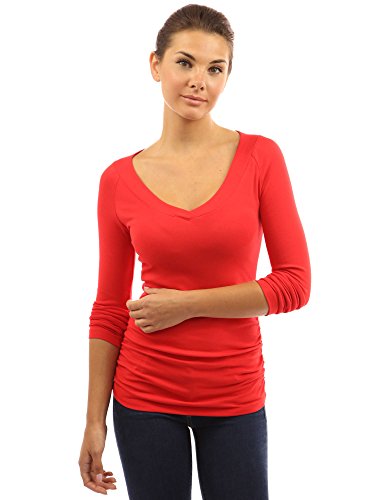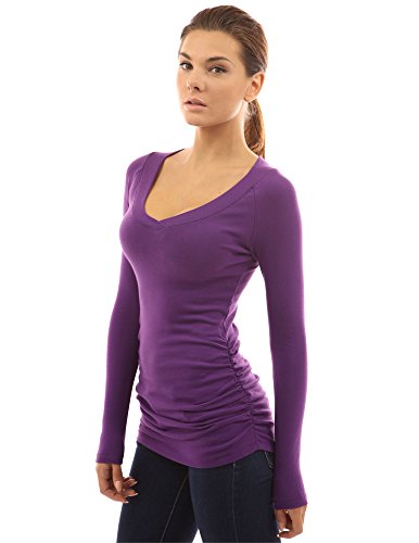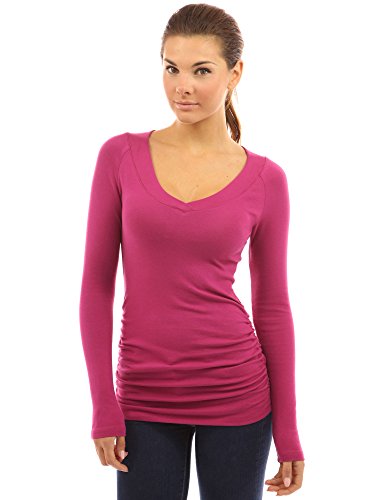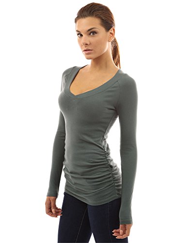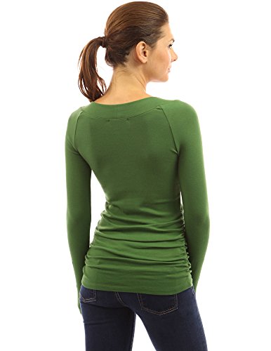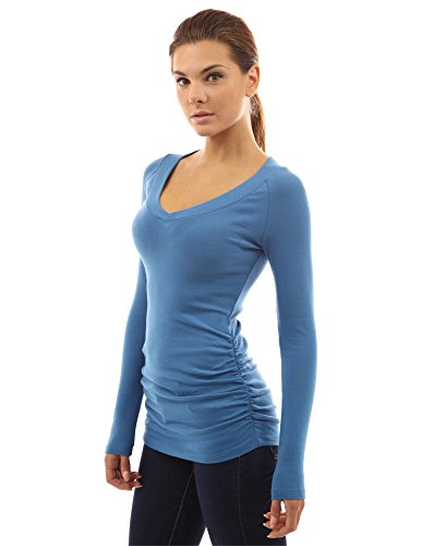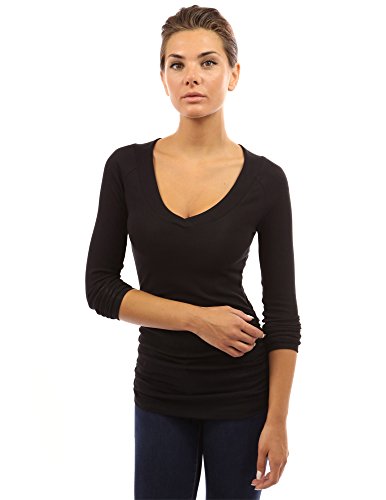 Cotton Blend Raglan V Neck Long Sleeve Ruched Sides Stretch Casual Top. Model in pictures is 5 feet 8 inches (173cm) tall wearing size S.