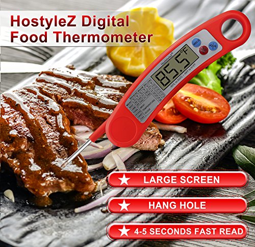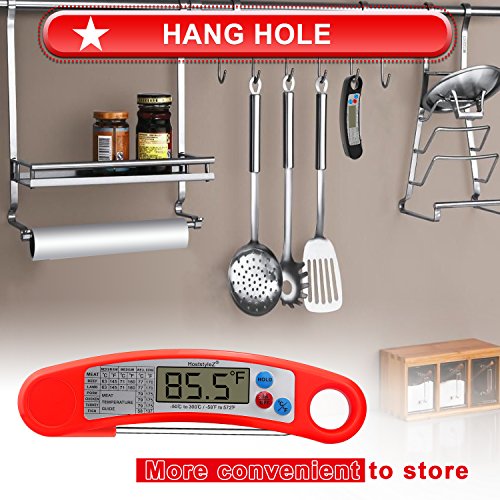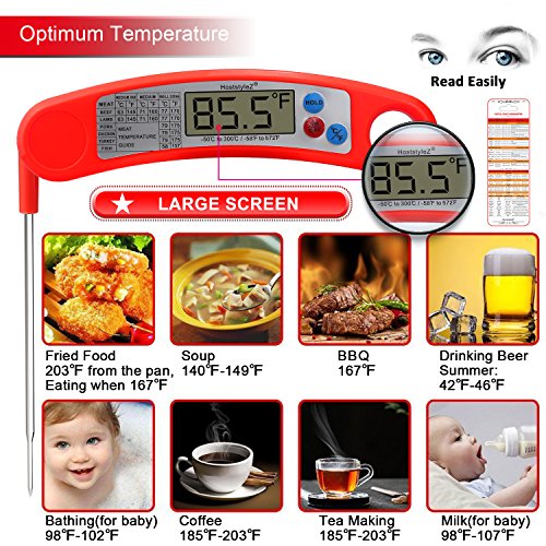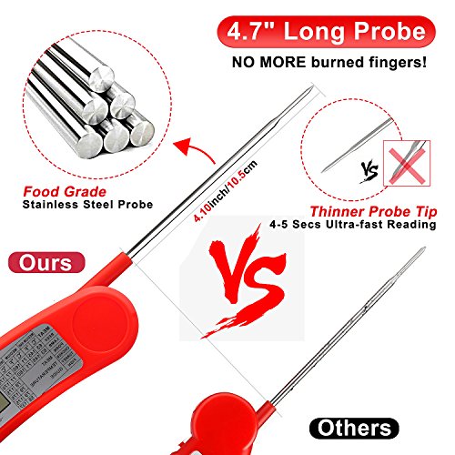 -. Feature : ❈Super Fast & Accurate Meat Thermometer: This kitchen thermometer can read out temperature in 4-5 seconds, great to help you to avoid overcooking; With advanced sensitive sensor chip, excellent to provide accurate temperature; / ❈Auto-Off Smart Design: After used, the probe can be foldable and the thermometer will be off automatically; Folded to compact size make it easy to carry like put into the apron pockets, and store in your kitchen drawer or hang in anywhere; / ❈Long Stainless Steel Probe: The digital food thermometer has 4.7" long probe which made of food grade stainless steel material, easy to test your grilling steak, boiling water, hot milk or BBQ meat and no worry about burning your fingers; / ❈Detailed Meat Temperature Chart: You can quickly check the ideal temperature in the food thermometer for your beef, lamb, pork, chicken, turkey and fish; Package include waterproof detailed temperature chart to help you control the temperature when cooking; / ❈Large LCD Readout Display: The meat thermometer is easy to use, simply open and clean the probe, press ON button and choose ℃/℉, insert into your food or liquid, and read out the temperature in the large LCD display(NEVER use the meat thermometer in a closed OVEN!)