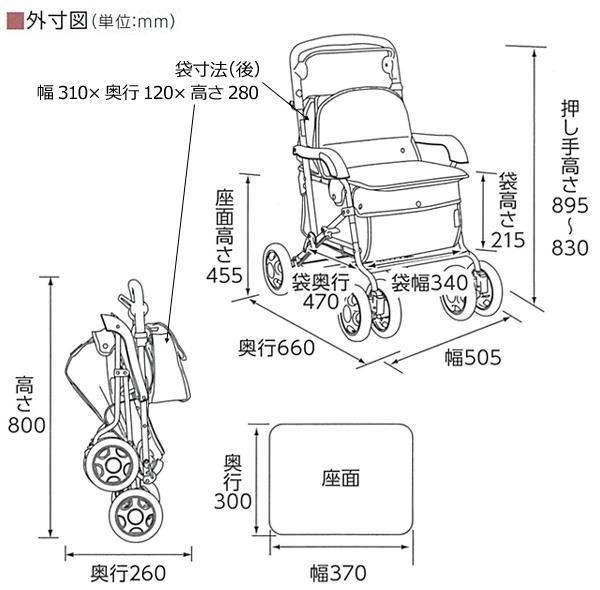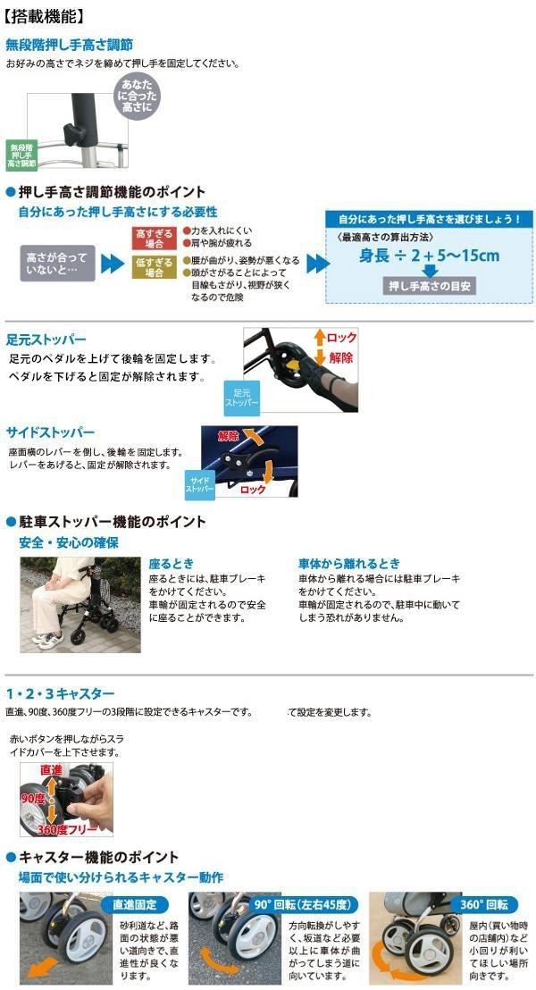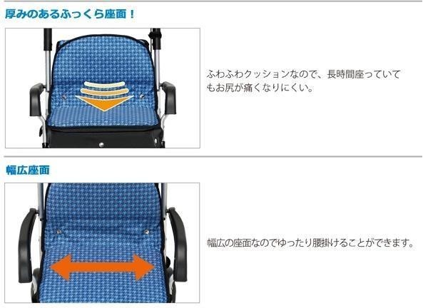 座面下の大容量収納、大きな前輪と幅広の後輪による安定性、長時間座っていても疲れにくい広々座面が特徴のスタンダードタイプのシルバーカーです。毎日のお買い物や、お出かけの時に最適です。 |