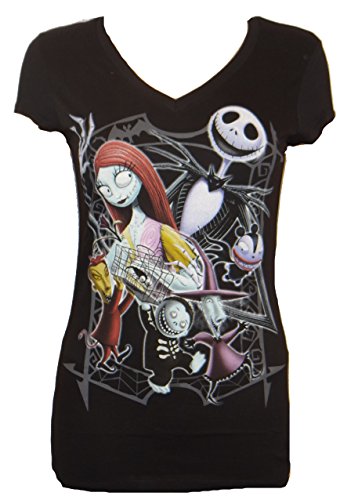 This juniors tee features Jack and Sally along with Lock Shock and Barrel on this v-neck shirt.