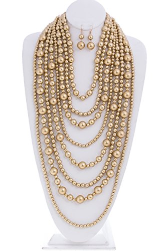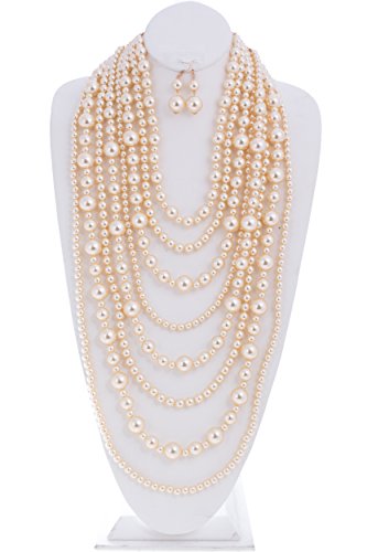 Necklace features eight layers of simulated pearls strands attached to a chain. It also has a lobster clasp closure and adjustable chain. Drop earrings feature two pearls and french wire hook.