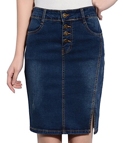 -. Title : ELPIS レディース クール カジュアル シンプル ベーシック ハイウエスト デニム タイト スカート サイド スリット フロント ボタン 膝上丈 美脚 セクシー