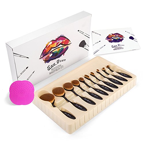 -. Feature : Fashion Toothbrush Design, Silky Soft, makes applying makeup a luxurious experience. Sunyear Makeup Brushes Toothbrush maybe the best quality cosmetics on the market. Meanwhile, prepare for a free gift for you --the Latest Brush Cleaner Mat. No need to worry about cleanliness. / The Brush hair is made of high quality synthetic fiber hair which provides superb ability to hold powder. Give you a flawless foundation application every single time. No streaks and no areas with too much makeup or too little. / Compatible with any type of foundation, BB Cream, powder, blush, etc. Oval, angular surface offers effortless application and seamless blending. Flexible tilted handle for precision and stability. Easily and beautifully crafted to blend foundation, powder, cream, fluid, moisturizers and P.R.Imers seamlessly into your skin. / Comfortable for your skin. Suitable for all types skin, including sensitive skin. They can protect and beauty your skin well. / 10pcs. From largest to smallest, brushes 1-3 can be used for foundations, 3-5 for contouring the forehead and cheekbones, 5-10 for concealer, 5 & 10 for eyeshadow, 6-8 for sculpting eyebrows, and 8 & 9 for lips. These brushes are rather universal in that they cover all needs in terms of application.