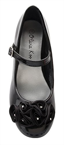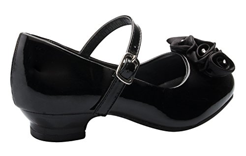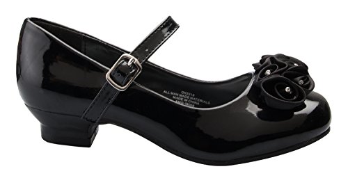 Mary Jane style party shoe with Pretty Satin Rolled Rosettes on the front; Man made patent leather with straps; Available in sizes Kids 8 - Youth 4Feature
