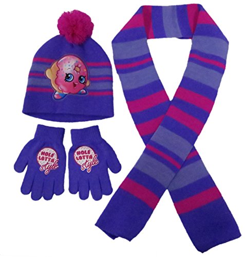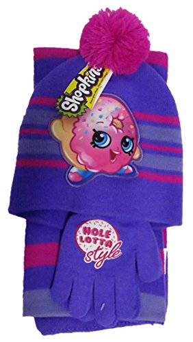 Binding : Apparel Product Description Shopkins fan will love keeping warm in the winter with this beanie hat, Scarf and Glove set! Beanie features Pink Pompom, striped Colors. D'lish Donut, Purple gloves Hole lotta style printed. Includes: scarf features striped colors. Officially Shopkins Licensed Merchandise, One Size Fits Most Girls, 0
