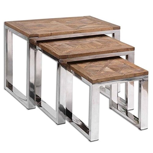 -. Feature : Set includes 3 nesting tables / Sustainably built of reclaimed fir and stainless steel / Natural, distressed wood finish / Steel is polished to a high sheen / 2 smaller tables nest neatly beneath larger table