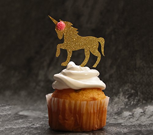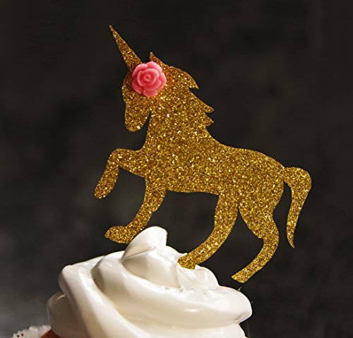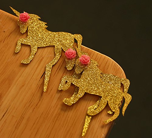 Includes: 1 pcs big pink unicorn cake topper with white cloud and gold star, 12 pcs gold glitter unicorn cupcake toppers embellished with pink roses.
