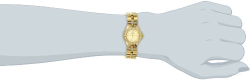 The sophisticated Invicta Women's Wildflower Collection 18k Gold-Plated Crystal Accented Watch offers a gold-toned dial with gold-toned, bar-shaped hour indexes, gold-toned hands, and a Roman numeral hour index at twelve o'clock. The minimalist dial is surrounded by an 18k gold-plated stainless steel bezel studded with sparkling, white crystals. The monochromatic look emphasizes the understated elegance of the timepiece. It continues with the 18k gold-plated, stainless steel bracelet with a jewelry clasp. Made from flame fusion crystal, the window is sturdy and scratch resistant, and the watch is water resistant to 165 feet (50 meters). Plus, it features precise Swiss quartz movement for accurate timekeeping.Wildflower Collection