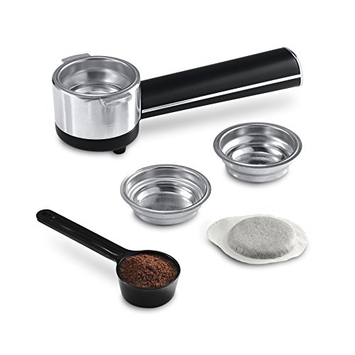 -. Feature : Elegante Metalloptik mit mattem Finish und verchromten Details / 15 bar Pumpendruck für optimalen Kaffeegeschmack / Cappucino System für cremigen Milchschaum / für gemahlenen Kaffee oder E.S.E. "Easy Serving Espresso" Pads / für 1 oder 2 Tassen geeignet / beheizte Tassenabstellfläche