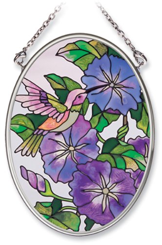 Amia Hand Painted Glass Suncatcher with Morning Glory and Hummingbird Design, 3-1/4-Inch by 4-1/4-Inch Oval