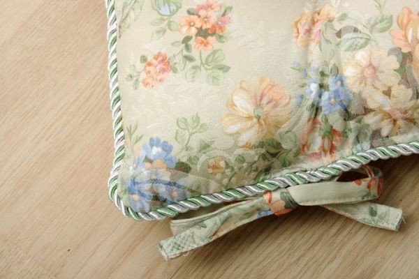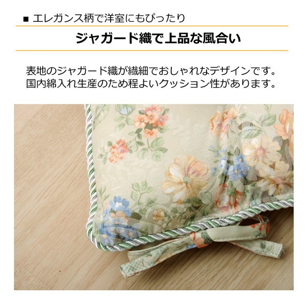 エレガンス柄のクッションです。人気の柄で洋室にもぴったりの商品です。表地にはジャガード織の生地を使用しているため繊細な柄と上品な風合いが特徴の商品です。国内で綿入れ加工をしているため程よいクッション性があります。