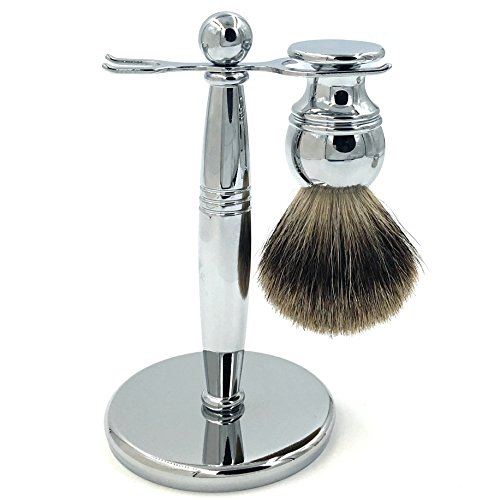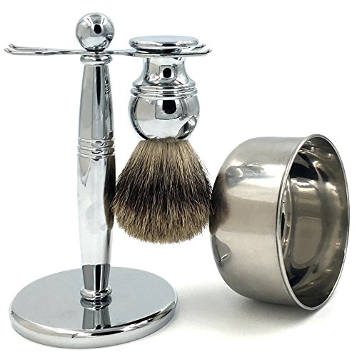 Genuine Badger Brush Deluxe Chrome Brush Handle + Stainless Steel 420 Soap Bowl/Mug + Shaving Brush Stand Holder for Razor and Brush