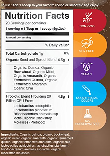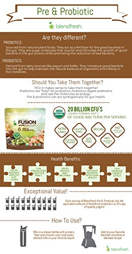 Blendfresh Pre&Probiotic Fusion is formulated with a diverse fusion of 6 different seeds and sprouts. Ingredients include: organic quinoa, organic buckwheat, organic millet, organic amaranth, organic fermented amaranth, lactobacillus acidophilus, lactobacillus plantar, bifodobacertium animals sip lactic and organic blackstrap molasses. Each serving provides 20 billion CFUs (colony-forming-units) of good bacteria that support healthy gut flora. That's the same as eating up to 15-20 cups of the most popular yogurts, but with a lot less sugar! Blendfresh - Nutrition Made Easy! According to websites mayoclinic.org/healthy-lifestyle and precisehealthsolutions.com, plant-based, whole food Pre&Probiotic with 6 diverse blends of seeds and sprouts, which provide 20 Billion CFUs (colony-forming-units) of good bacteria offer health benefits including:Feature