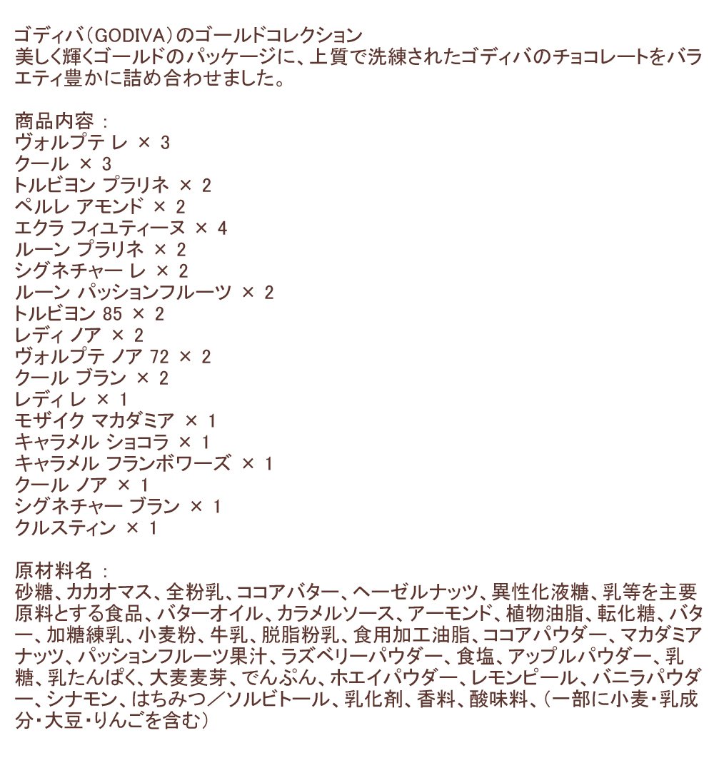 美しく輝くゴールドのパッケージに、上質で洗練されたゴディバをバラエティ豊かに詰め合わせました。