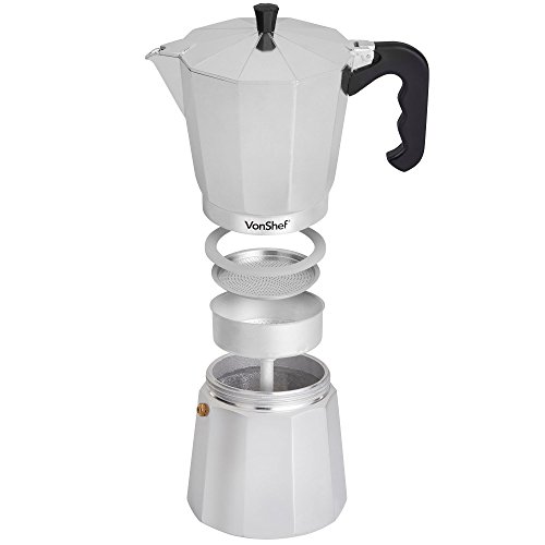 The VonShef Espresso Macchinetta is the most authentic way to make delicious espresso coffee in the comfort of your own home. Made from aluminium, this quality machine draws water from the base through a funnel filter where it infuses with the ground coffee, before passing up into the top section of the Macchinetta, to be collected.