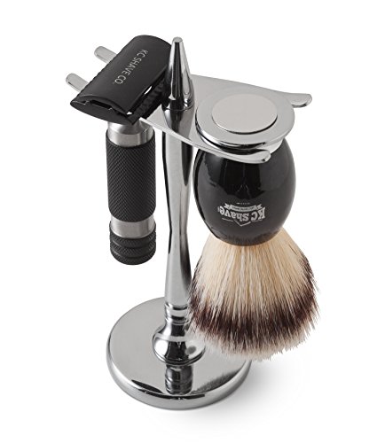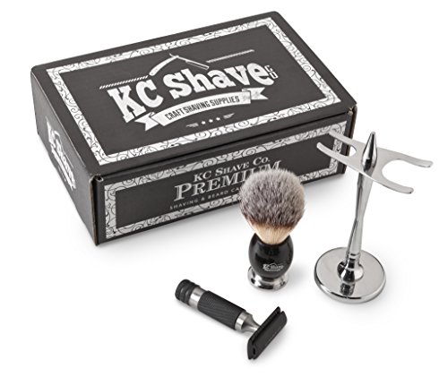 Product Description Our KC shave kits set the standard in quality. Complete with a beautiful shave brush, you cannot go wrong with an exquisite gift such as this. Choose from the matte black Angelo kit or the silver Lincoln kit. A beautiful stand to hold your razor is included and transforms it into a neat display for any vanity! 0