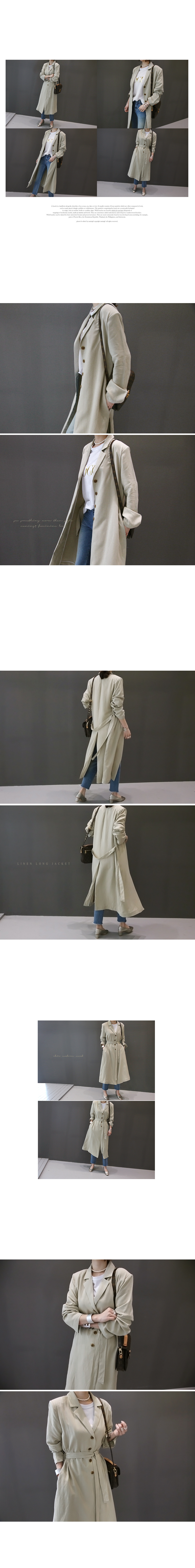 무릎을 넘는 롱한 기장감으로 시크하고 모던한 분위기를 완성해주는 린넨 자켓이에요.
