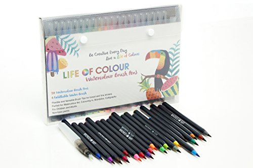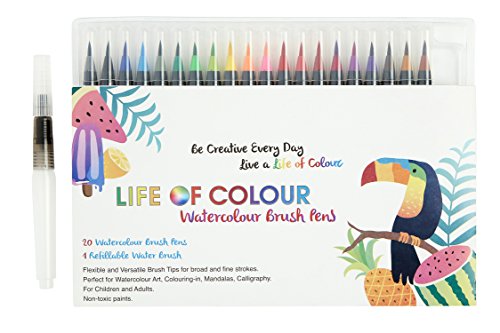 - We have made it easy for everyone, both adults and children to be creative and artistic with these awesome Watercolor Brush Pens. We have kept it simple and included 20 beautiful, vibrant colors plus 1 water pen in a small compact set, perfect for art-on-the-go, travelers and taking to school. No other instruments needed (except your paper of course)