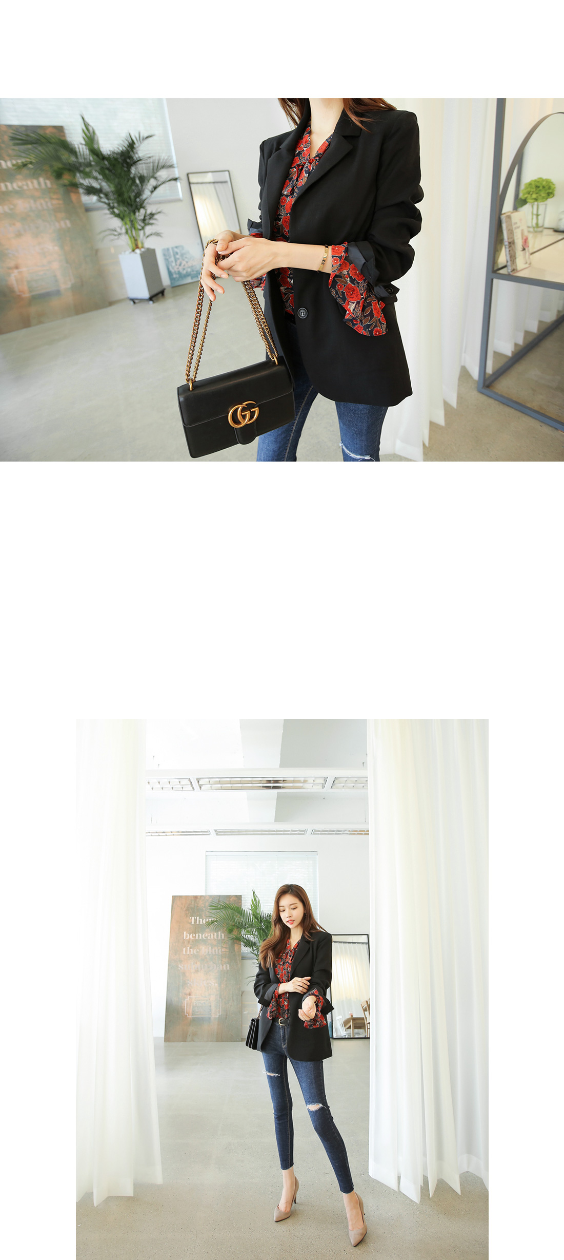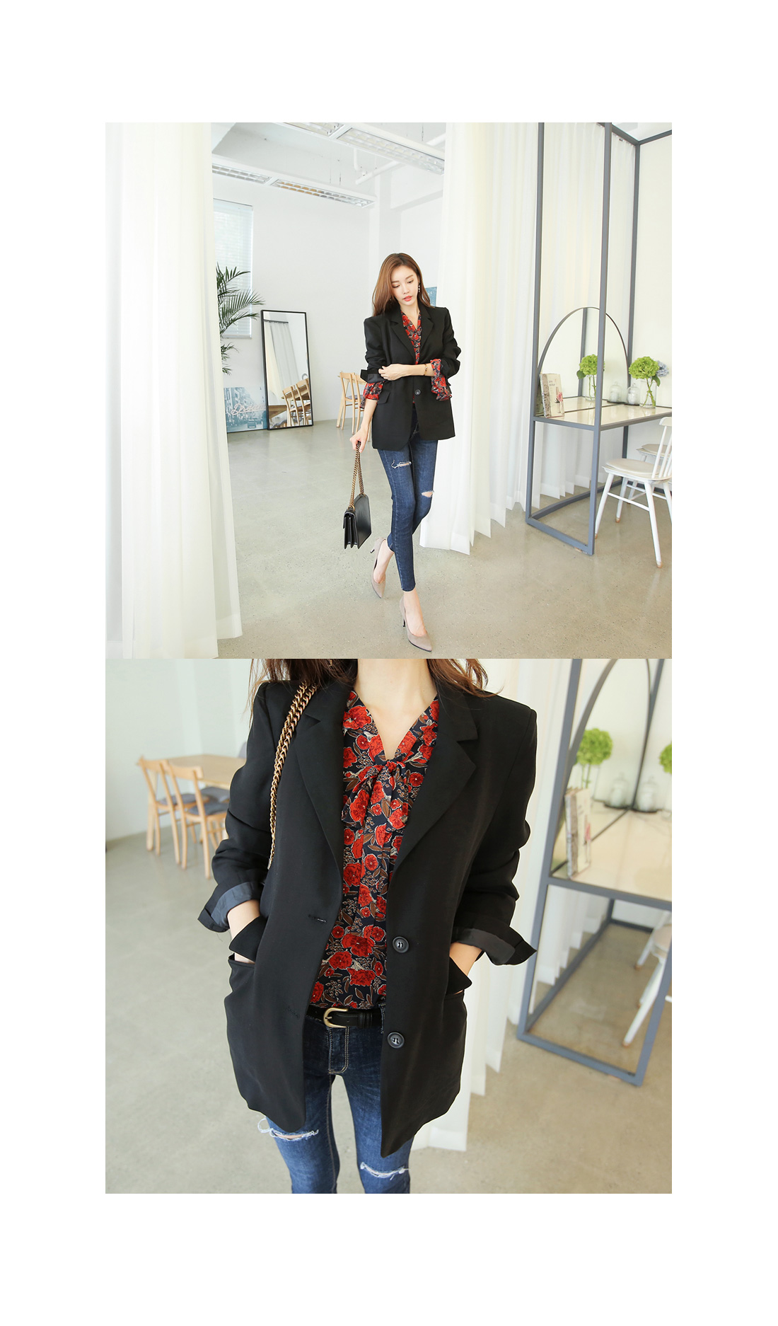 팬츠와 함께 매치하여 세련되고 모던한 느낌으로 연출하거나