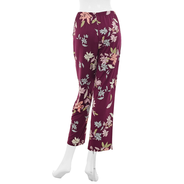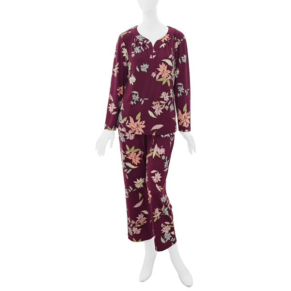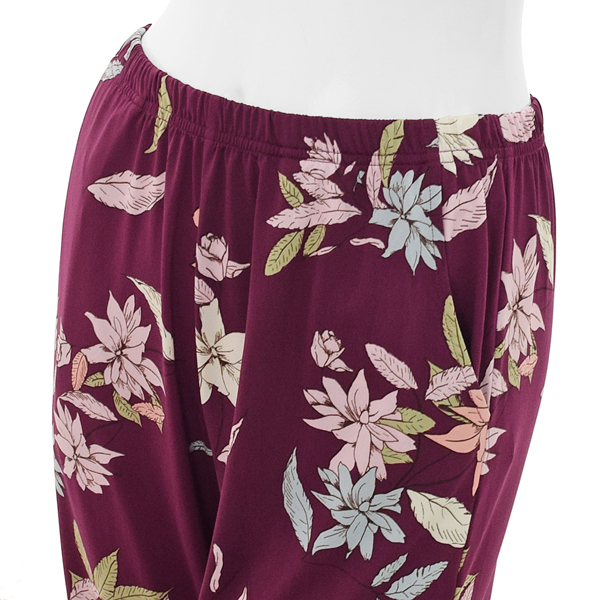 와인컬러에 화사한 컬러감의 플라워프린트 제품으로 화사한 실내복을 찾는 중장년층 분들에게 추천드리는 제품입니다.