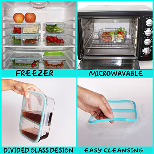 Sunspeed Glass Food Storage Container Set - 2 Compartments Container with Snap Locking Lids - Airtight, BPA Free,Microwave,Freezer & Oven,Dishwasher safe [3-Pack,32 oz, Rectangle]