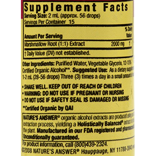 Studio : Nature s Answer Publisher : Nature s Answer Product Description Nature s Answer Marshmallow Root Description: Organic Alcohol Fluid Extract (1:1) Althaea officinalis Promotes a Healthy Throat Holistically Balanced Nature s Answer organic alcohol extracts are produced using alcohol, water and coconut glycerin utilizing our cold Bio-Chelated proprietary extraction process, yielding a Holistically Balanced standardized extract. Liquid extracts are absorbed faster than tablets or capsules and are more potent than tinctures. Holistically Balanced guarantees that the constituents of the extract are in the same synergistic ratios as in the plant. Disclaimer These statements have not been evaluated by the FDA. These products are not intended to diagnose, treat, cure, or prevent any disease. 0 |
