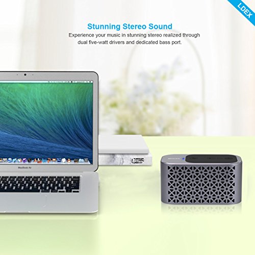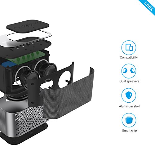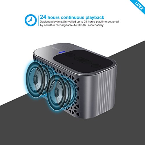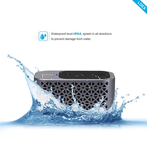 -. Feature : Stunning Stereo Sound: Experience your music in stunning stereo realized through dual five-watt drivers and dedicated bass port. / Bluetooth 4.0: Instantly connect to your smartphone or tablet from up to 33 feet away . Exquisite Aluminum alloy finished / Ture three anti:Designed as a Outdoor Speaker and Shower Speaker - Unique Red Square Design with Splashproof & Shockproof & Dustproof & functions make it suitable for Outdoors and Shower. Please note the speaker cannot withstand being partially or fully submerged in water or being dropped into water. / Daylong playtime:Unrivalled up to 24 hours playtime powered by a built-in rechargeable 4400mAh Li-ion battery. / Package contents:LDEX Portable Bluetooth Speaker, micro USB cable, audio cable.
