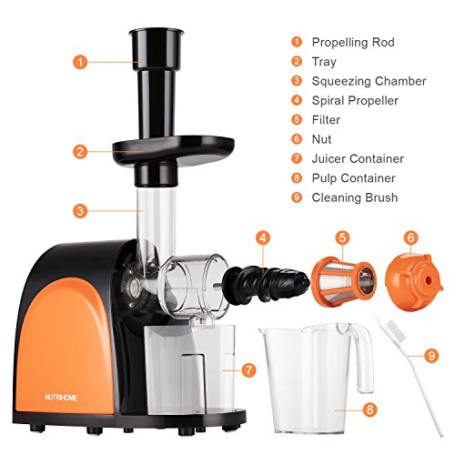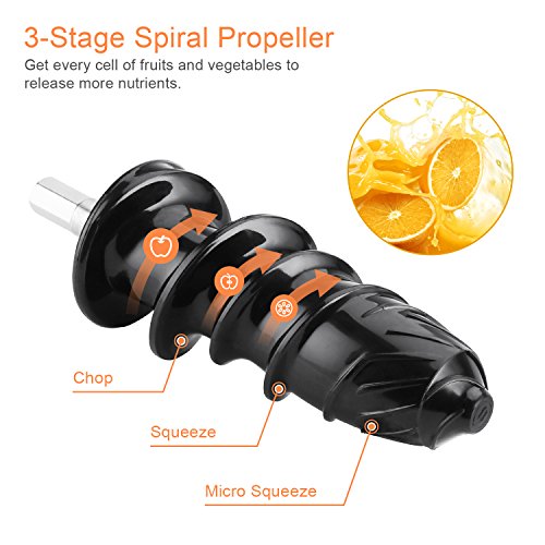 ●2018 upgraded masticating juicer, with stronger motor and high quality spiral propeller, easy to squeeze juice and preserve the nutrients.