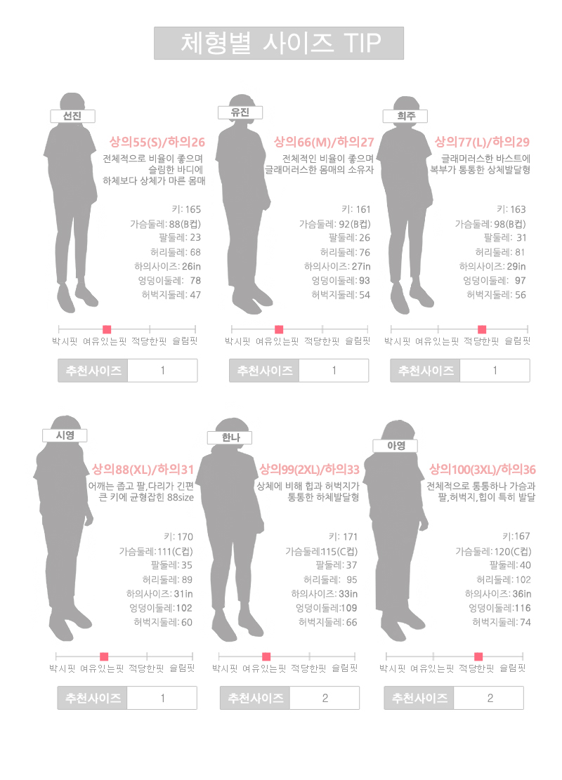 88에서 100까지 분들께는 2사이즈를 추천해 드려요.자세한 사이즈는 상세 사이즈 표를 참고해 주세요^^