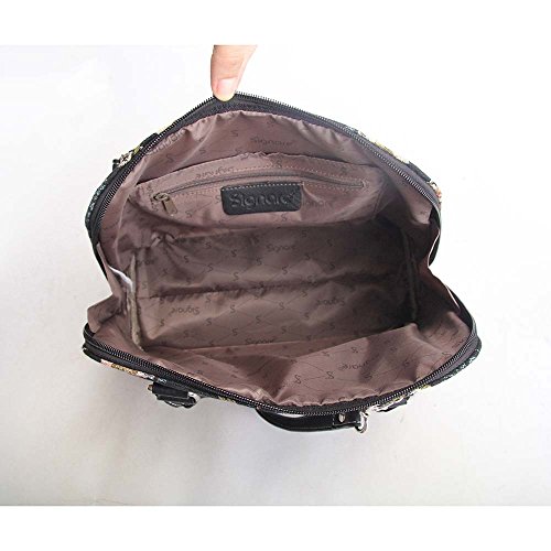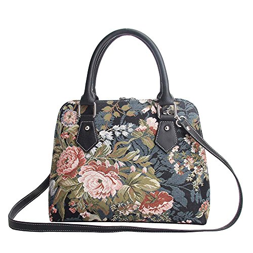 Signare Women’s Fashion Canvas Tapestry Top Handle Handbag with Detachable Strap to Convert to Shoulder Bag with Peony Flower in Black (CONV-PEO)