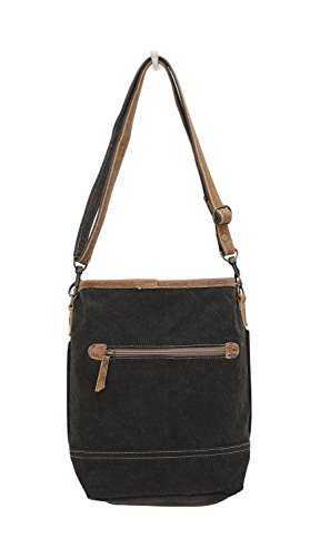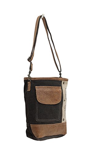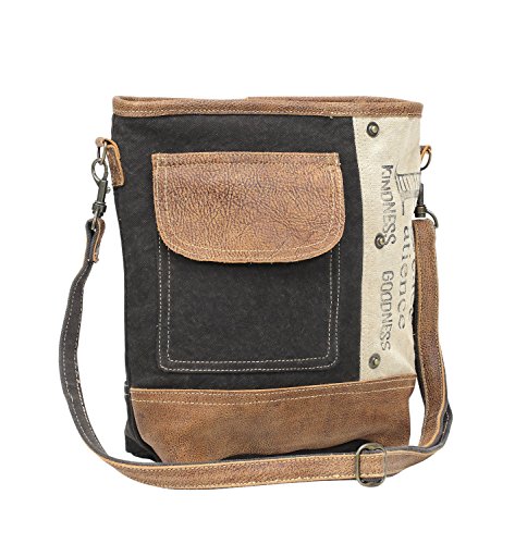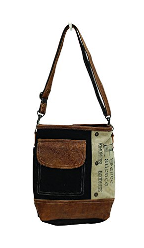 Peace Pocket Shoulder Bag, Dark denim canvas and cream color stamped canvas, Leather accents