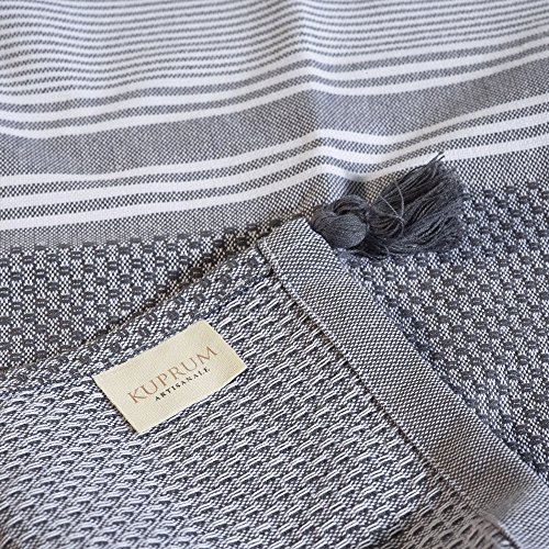 Product Description Please wash your pestemal before first use. Pestemal towels get softer with each wash and are very durable. The Pestemal is also known as a Fouta Towel, Hammam Towel or a Turkish Bath Towel. The pestemal is a light, highly absorbent and fast drying, cotton woven cloth, traditionally used in Turkish Baths. The Pestemal originated around 600 years ago. The pestemal weaving custom has roots in an area once called Tripolis of Phrygia. This pestemal town is called Buldan today, a district in Southern Turkey. The pestemal is celebrated for being light yet highly absorbent. The smaller, hand towel size pestemal is traditionally called "peskir". Given its properties, the pestemal makes a great spa or sauna towel. The pestemal can also be used as a hand towel at home. The fast drying pestemal feature helps prevent mildew that commonly occurs in bathrooms with less air circulation. Additionally, the pestemal folds easily and takes up less space in your closet. The pestemal adds a subtle boho, ethnic look to your home. The Kuprum Pestemal has fashionable tassels and elegant, traditional pestemal weaving patterns. This Pestemal is created by the Kuprum brand, inspired by Mediterranean culture, artisanship and practicality. 0